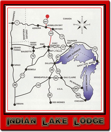 Follow the Provincial Route #17/TransCanada Highway West 218 miles. Enter Vermilion Bay and head North on Highway 647 (turn right at the Shell/Bobby's Corner). Follow for approx 7 miles. Indian Lake Lodge is on the left.